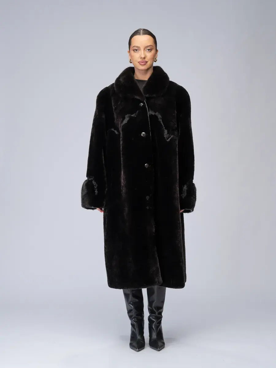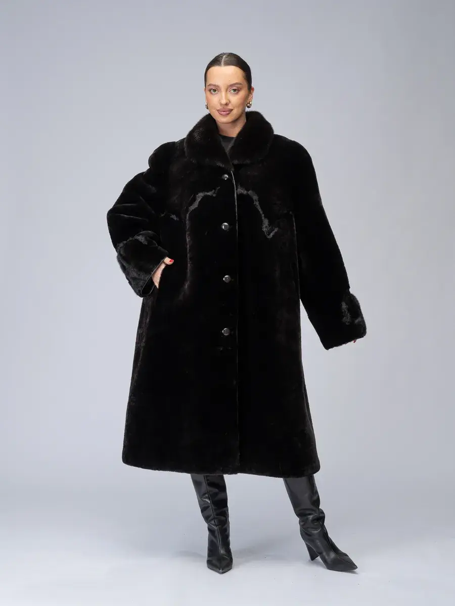 Шуба натуральная женская зимняя от меховой фабрики "Panafics Furs" город Пятигорск. "Panafics Furs" - это эксклюзивная верхняя одежда с безупречным кроем и высоким качеством. Шуба мутоновая длинная женская зимняя (цвет черный), большие размеры. Длина по спинке 115 см ниже колена. Подойдет как для высоких, так и для невысоких девушек. Шуба из натуральной овчины с отложным воротником на пуговицах с отделкой из натурального меха каракуля. Воротник и манжеты отделаны натуральным мехом норки. Шуба легкая. Есть глубокие теплые карманы. Такая модель шубы из натуральной овчины позволяет создать оригинальный образ. Обладательница шубы из натуральной овчины всегда сможет продемонстрировать всю красоту меха, подчеркнуть свой статус. Шуба натуральная мутон шьется из меха афганской овчины – мех бархатистый, струящийся, упругий, с равномерной плотностью и толщиной материала по всей поверхности изделия. Мутоновая шуба – не только красивая, но и теплая, так как натуральный мех обеспечивает тепло и комфорт даже в самые холодные дни. Температурный режим до -30.