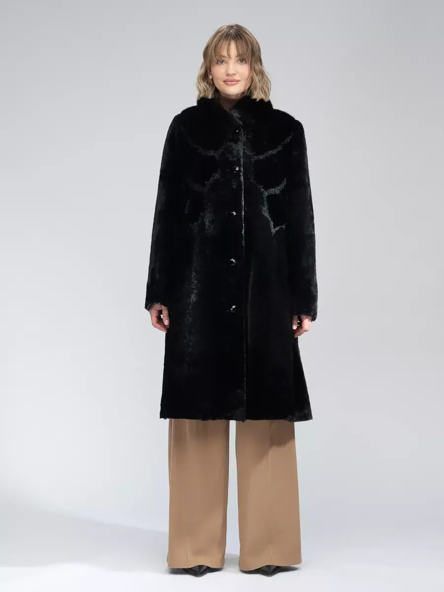 Шуба натуральная женская зимняя от меховой фабрики "Panafics Furs" город Пятигорск. "Panafics Furs" - это эксклюзивная верхняя одежда с безупречным кроем и высоким качеством. Шуба мутоновая длинная женская зимняя (цвет темный горький шоколад). Длина по спинке 105 см ниже колена. Подойдет как для высоких, так и для невысоких девушек. Шуба из натуральной овчины с воротником стойкой на пуговицах с отделкой из натурального меха каракуля и кристаллов. Воротник и кокетка отделаны натуральным мехом норки. Шуба легкая. Есть глубокие теплые карманы. Такая модель шубы из натуральной овчины позволяет создать оригинальный образ. Обладательница шубы из натуральной овчины всегда сможет продемонстрировать всю красоту меха, подчеркнуть свой статус. Шуба натуральная мутон шьется из меха афганской овчины – мех бархатистый, струящийся, упругий, с равномерной плотностью и толщиной материала по всей поверхности изделия. Мутоновая шуба – не только красивая, но и теплая, так как натуральный мех обеспечивает тепло и комфорт даже в самые холодные дни. Температурный режим до -30. В нашем магазине есть шубы больших размеров, обратите внимание.